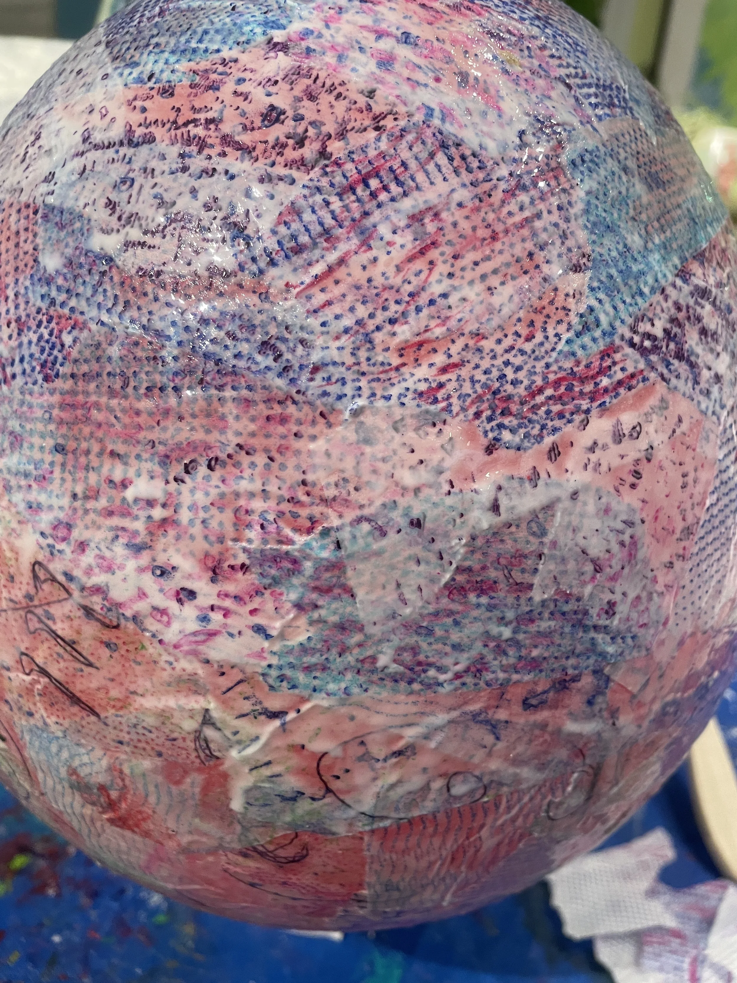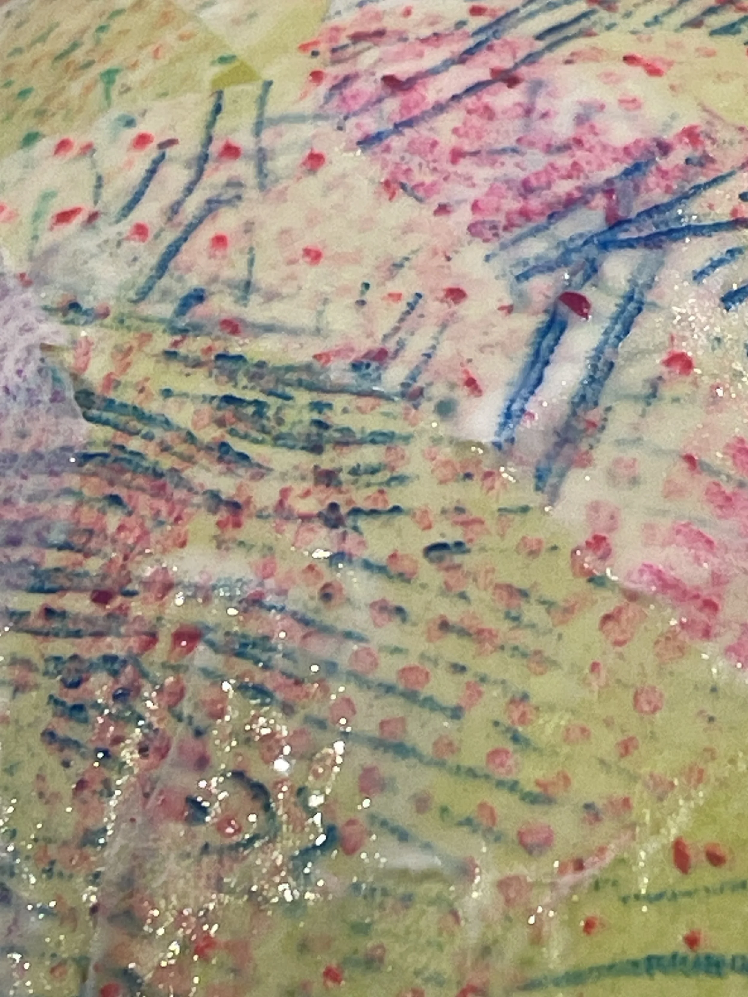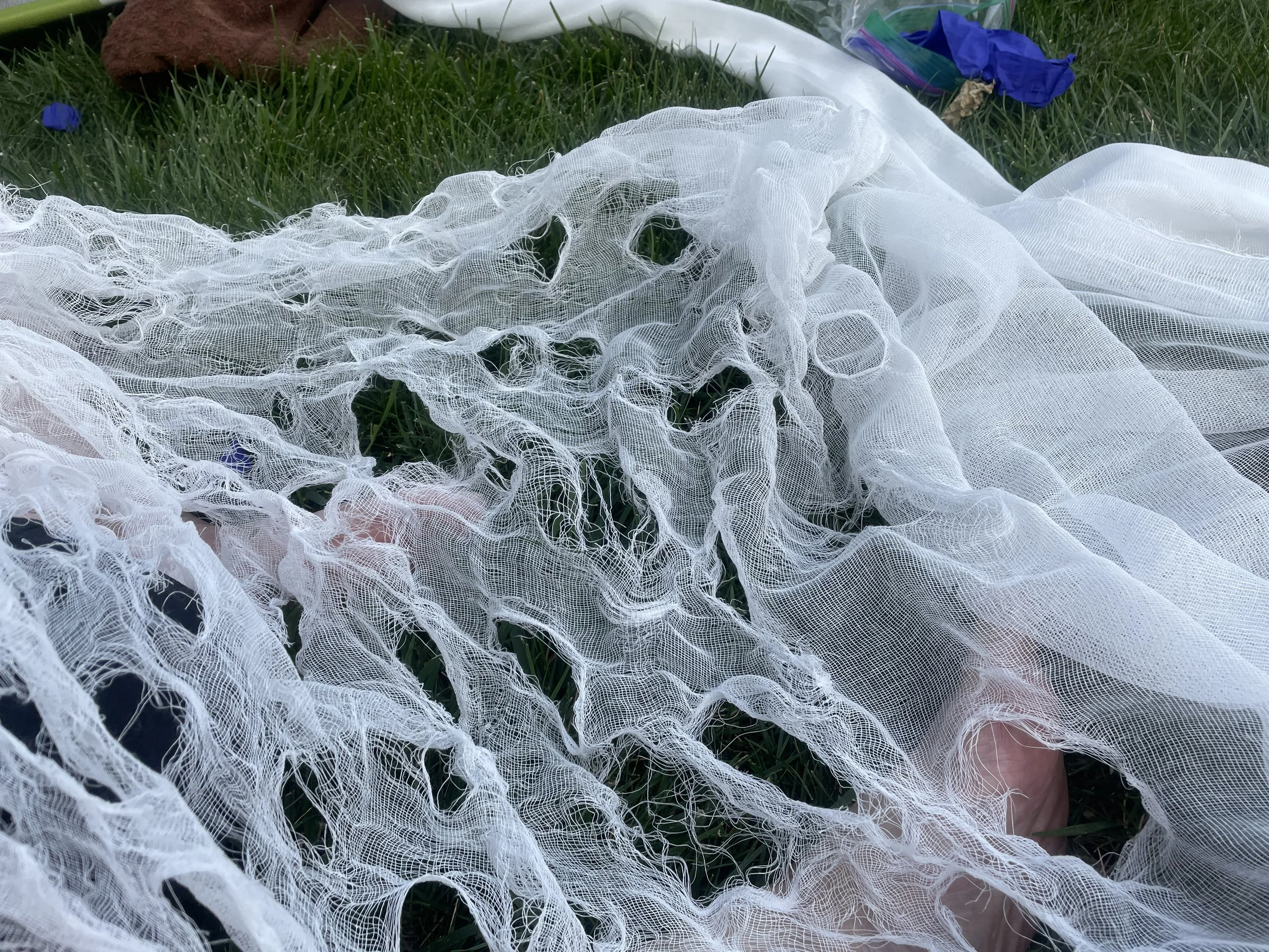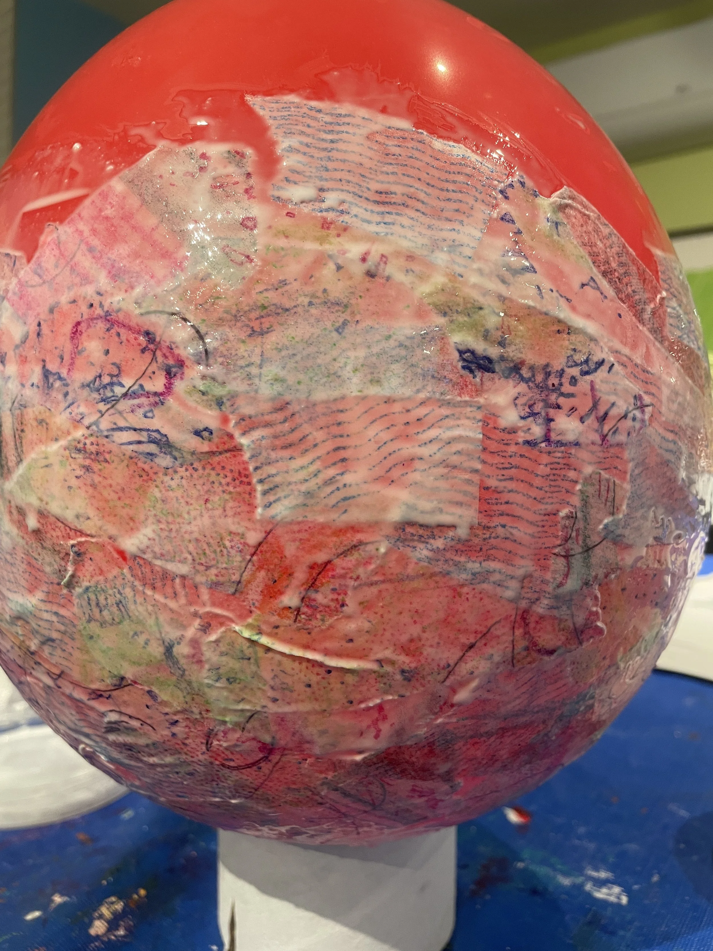 See the various components of “Connective Tissue” as the project evolves. There are balloons, tissue paper, crayons (for wax rubbings), cheesecloth, and more. The stories will be painted, torn and collaged onto balloons, written on ribbons, etc., and more will be added from time to time.
