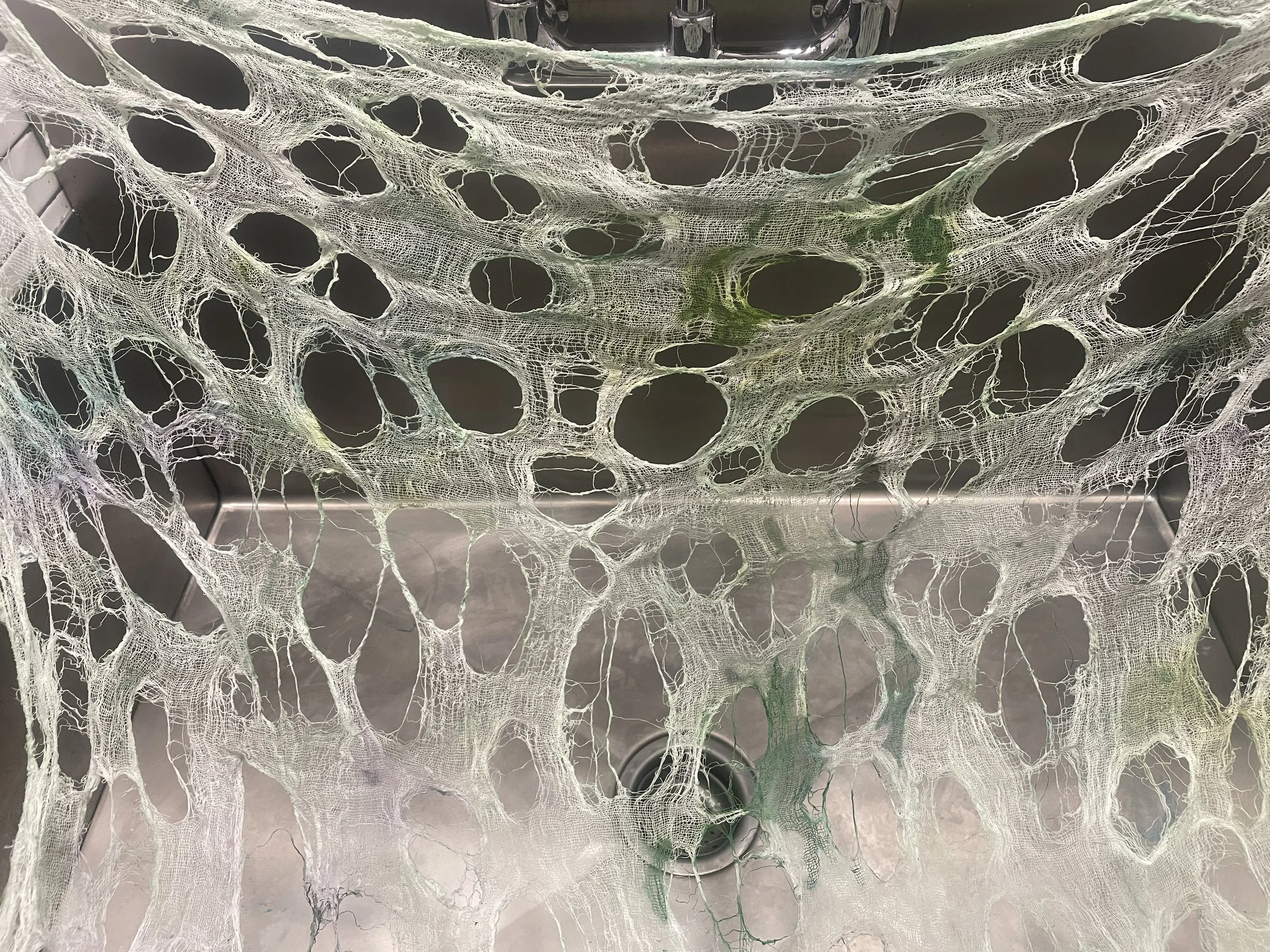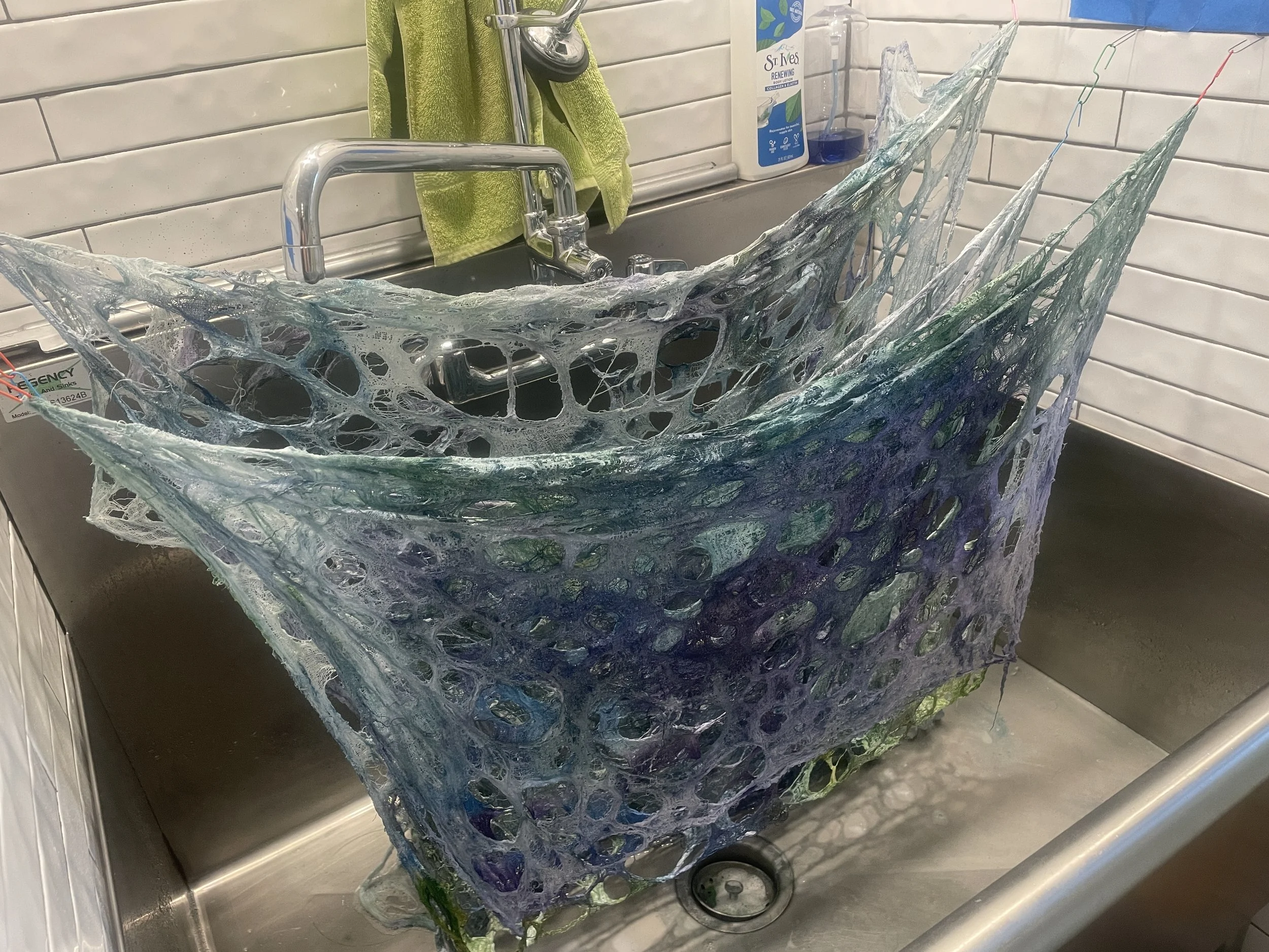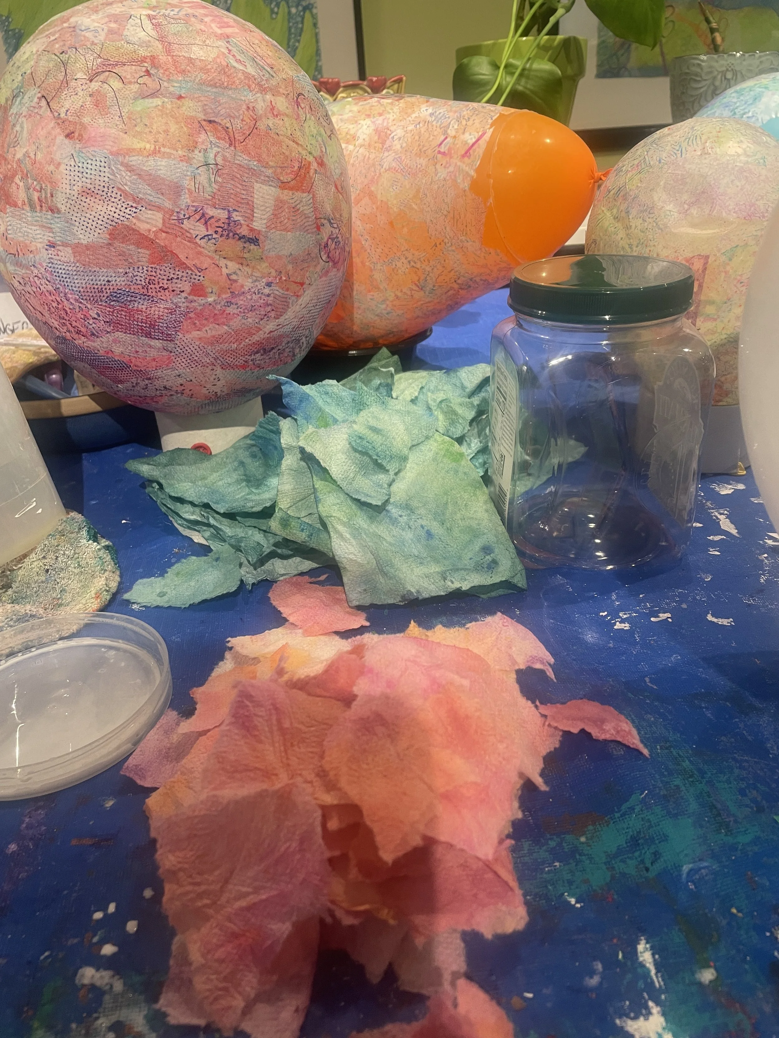 See the various components of “Connective Tissue” as the project evolves. There are balloons, tissue paper, crayons (for wax rubbings), cheesecloth, and more. The stories will be painted, torn and collaged onto balloons, written on ribbons, etc., and more will be added from time to time.